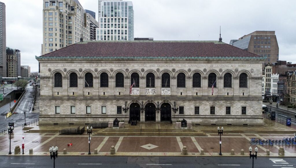Boston Public Library’s first building of its own was a former schoolhouse located on Mason Street that opened to the public on March 20, 1854. However, it was obvious from opening day that the quarters were inadequate for the library’s collection of sixteen thousand volumes. In December 1854, library commissioners were authorized to locate a new building on a lot on Boylston Street, which opened in 1858 at 55 Boylston Street with seventy thousand volumes. Twenty years later, as the library outgrew that space, the Trustees asked the state legislature for a plot in the newly filled Back Bay. On April 22, 1880, the state granted the City of Boston a lot at the corner of Dartmouth and Boylston Streets.