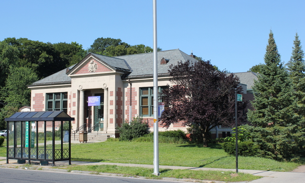 The Indian Orchard Branch Library is located in Springfield’s northeastern Indian Orchard neighborhood, at the junction of Worcester and Oak Streets. It consists of the original 1909 building, and an addition made to the rear. The original block is a single story in height, with walls that are mainly brick, and a slate hip roof. A gabled entry vestibule projects to the front, with the entrance recessed behind Tuscan columns. The flanking wall facades each have a band of three windows set in a shared opening. Both the building corners and window openings exhibit stone quoining. The interior retains many original features, including Tuscan columns and pilasters, and brick fireplaces